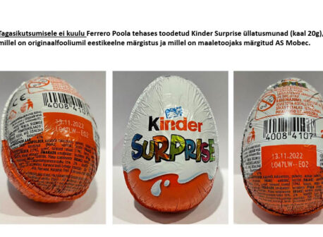 Avaldatud: 9 aprill, 2022Eesti erinevatesse kauplustesse on jõudnud Belgia tehases toodetud Kinder kaubamärgi maiustused, mis eemaldatakse ennetava meetmena müügilt. Tagasi ei kutsuta Poolas toodetud Kinder Surprise 20g üllatusmuna, millel on originaalfooliumil eestikeelne tekst ning kus on maaletoojaks märgitud AS Mobec.