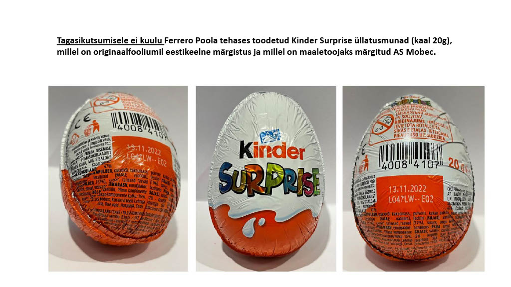 Tagasikutsumine ei puuduta Kinder Surprise 20g üllatusmuna, millel on originaalfooliumil eestikeelne tekst ning kus on maaletoojaks märgitud AS Mobec. Antud šokolaadid on toodetud Ferrero Poola tehases.