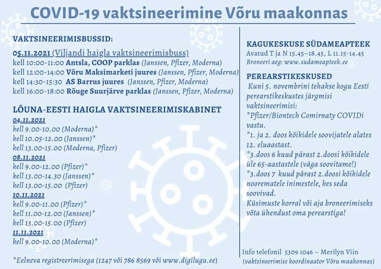 Avaldatud: 4 november, 2021COVID-19 vaktsineerimine Võru maakonnas 4. novembrist kuni 11. novembrini.