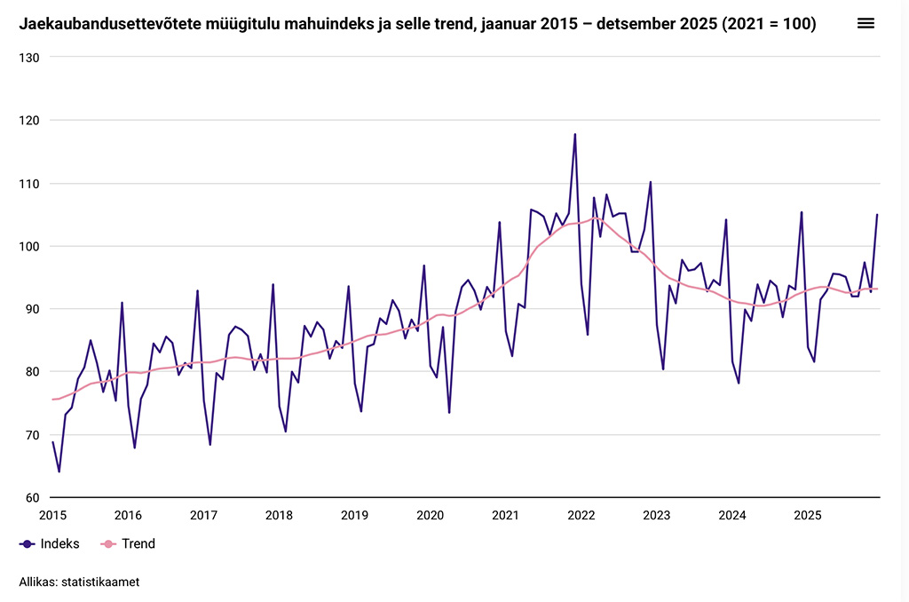 Detsembris jäi jaekaubanduse müügimaht võrreldes 2024. aasta detsembriga samale tasemele
