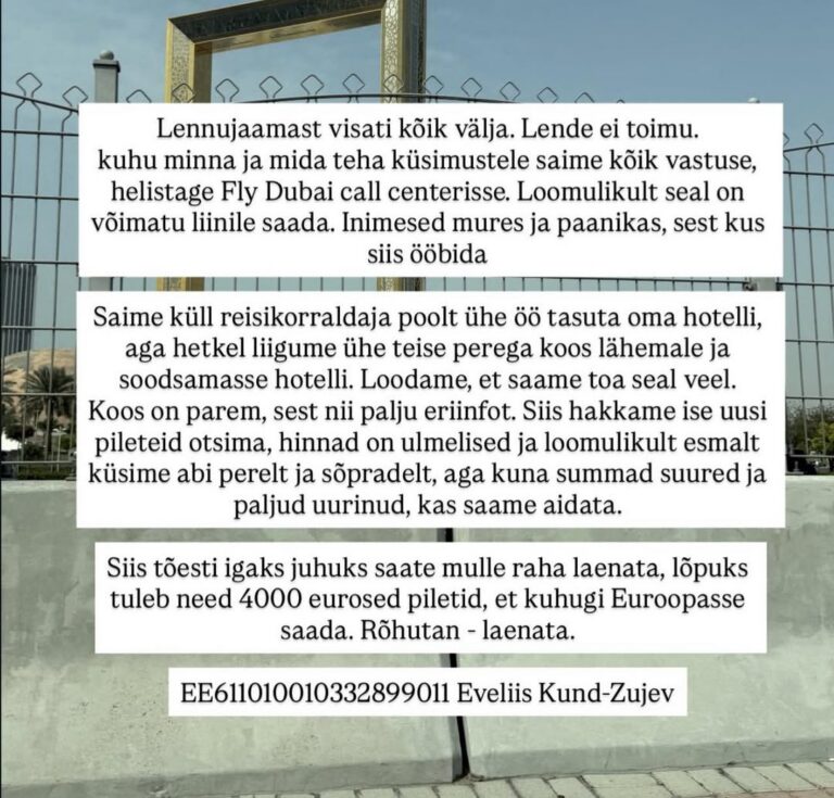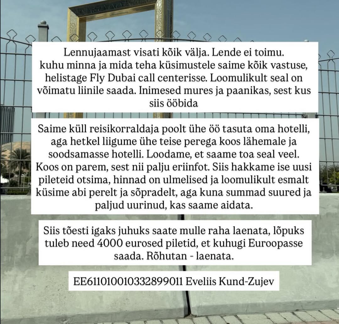 Avaldatud: 3 märts, 2026Dubaisse perega lõksu jäänud blogija Eveliis palub rahalist abi, et tagasi Eestisse pääseda.