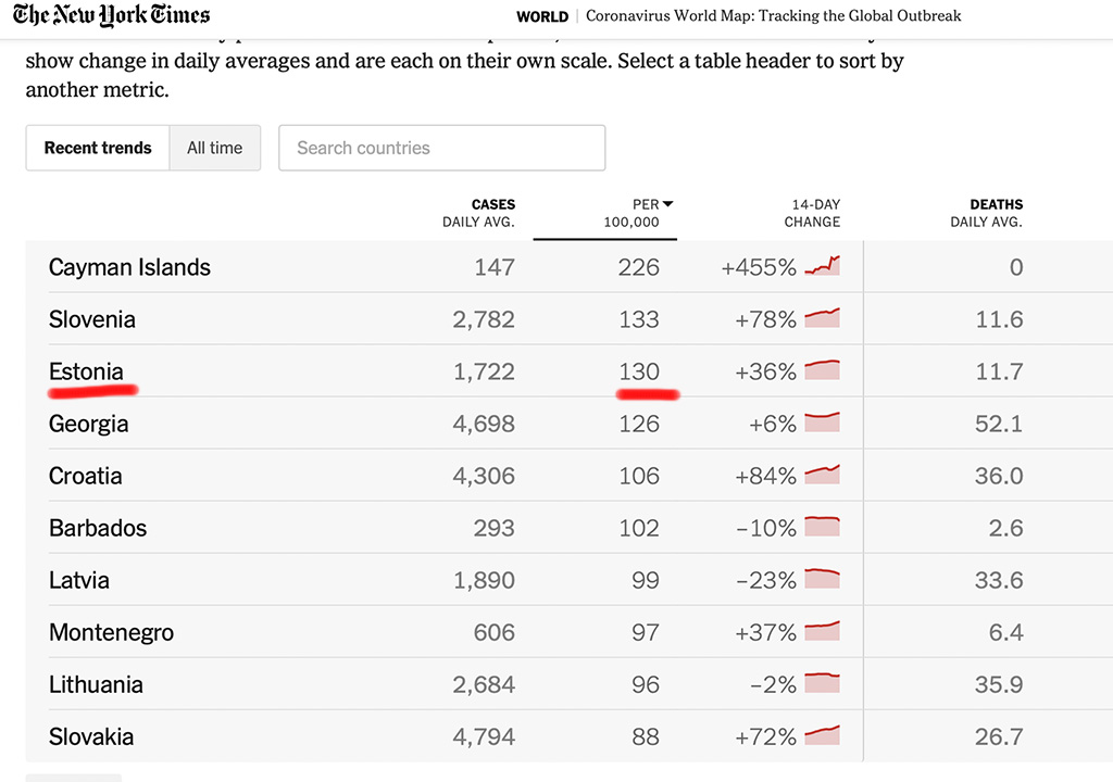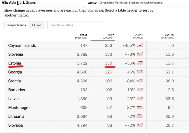 New York Timesi ülevaate kohaselt on täna pühapäeval, 7. novembril Eestist mööda läinud Sloveenia, kus viimase 7 päeva keskmine nakatumiste arv 100 000 elaniku kohta on 133 juhtu päevas. Eesti number on 130. Veel 3 päeva tagasi 4. novembril oli Eesti number 137. Sloveenia vaktsineerituse tase (54 protsenti elanikest) on veidi madalam kui Eestis (58 protsenti).