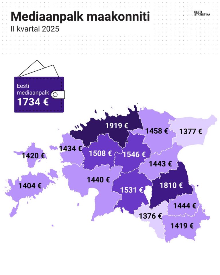 Eesti keskmine mediaanpalk oli 2025. aasta teises kvartalis 1734 eurot. Kõrgeim mediaanpalk on Harju maakonnas – 1919 eurot.