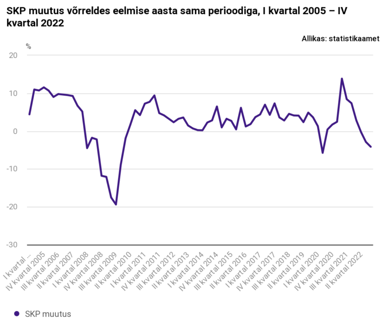 Võrreldes eelmise kvartaliga langes sesoonselt korrigeeritud SKP 1,6% ja võrreldes 2021. aasta neljanda kvartaliga 4,4%.