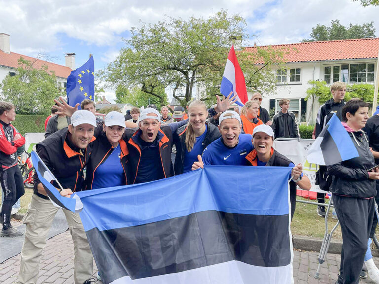 Eesti Tõukerattaliidu delegatsioon Euroopa meistrivõistlustel (vasakult): Ilo Suurmets, Annika Aust, Andrus Järg, Eliisa Villako, Aigar Nuuma, Margit Avikson. Foto: Eesti Tõukerattaliit Pühapäeval lõppesid Hollandis tõukerattasõidu Euroopa meistrivõistlused, mis kujunesid Eesti sportlaste jaoks väga edukaks. Viimasel päeval võisteldi maratonidistantsil, kus kõik neli starti läinud eestlast võitsid oma võistlusklassis hõbemedali.