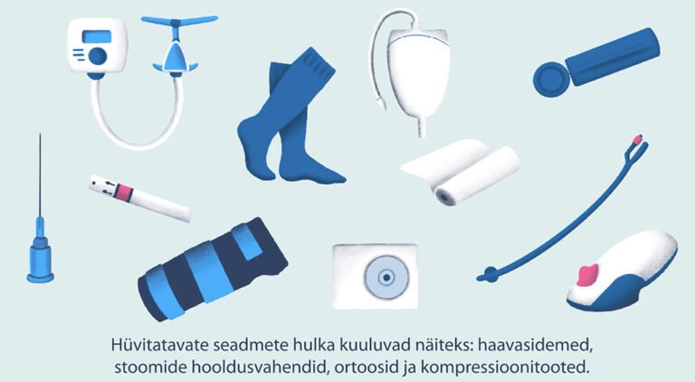 Hüvitatavate seadmete hulka kuuluvad näiteks diabeetikutele veresuhkru mõõtmiseks ja selle taseme korrigeerimiseks vajalikud tarvikud (glükomeetri testribad, lantsetid, insuliininõelad, glükoosisensorid), stoomide hooldusvahendid, ortoosid, põiekateetrid ja haavasidemed, samuti unehäirete ravi seadmed ja nende maskid ning kompressioonitooted nii lümfitursete kui ka venoosse puudulikkuse ja haavandite raviks.