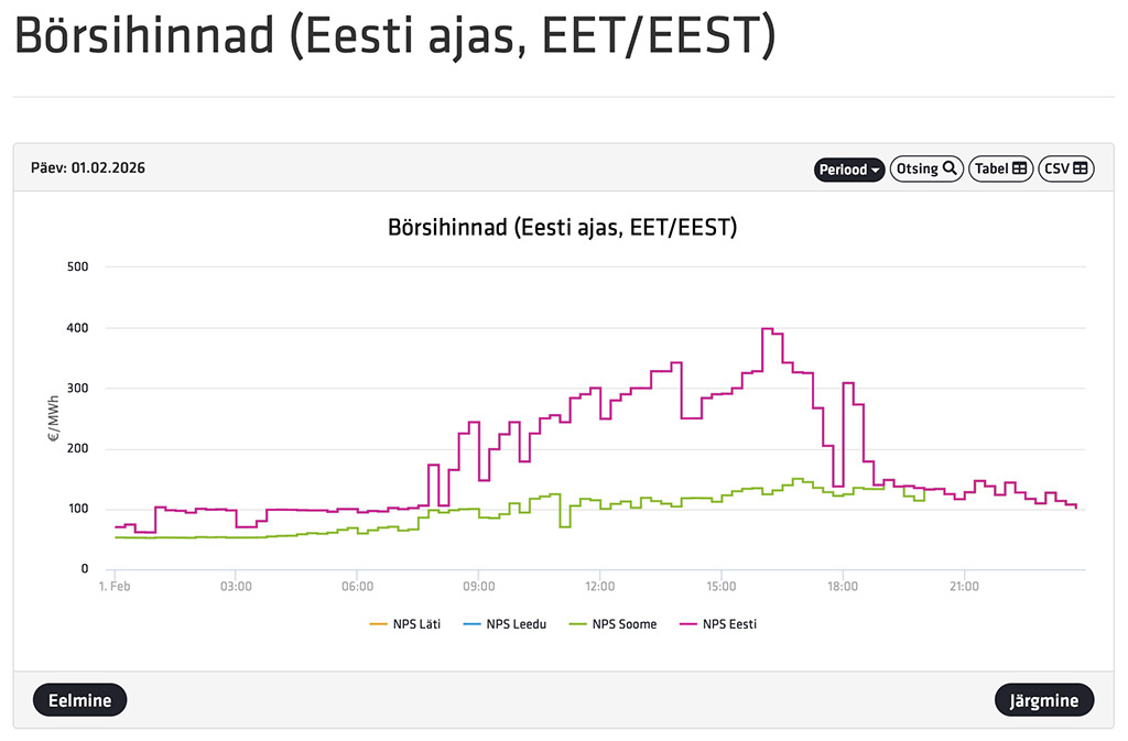 Avaldatud: 31 jaanuar, 2026Elektri börsihind püüab homme pühapäeval, 1. veebruaril 400 euro taset megavatt-tunni kohta. Elektri hind on kõige kõrgem päeval.