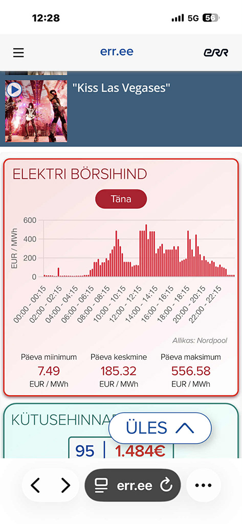 Hind kerkib pealelõunal 556 euroni MWh kohta. Õhtul on hind ligi 500 eurot MWh kohta.