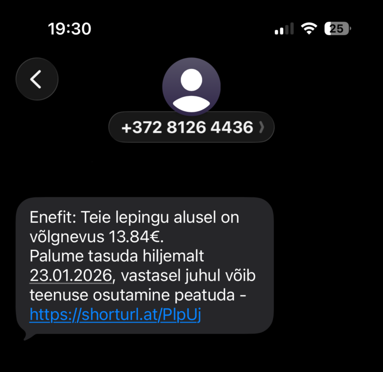Avaldatud: 20 jaanuar, 2026Elektrifirma Enefiti klienditeenindus on saanud vihjeid, et hetkel levib Enefiti võlateate sõnumiga petuskeem, mille eesmärk on juhatada inimesi õngitsuslehele.