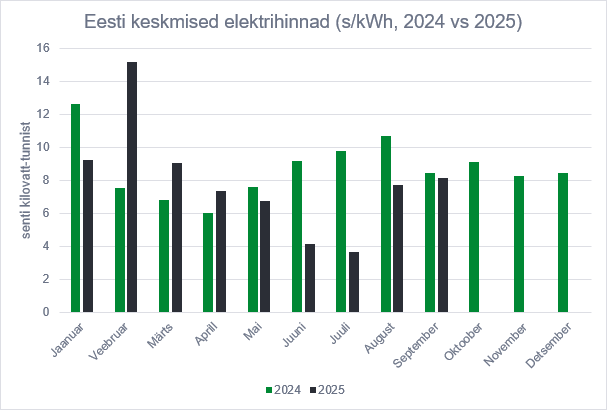 Avaldatud: 6 oktoober, 2025Septembris tõusis elektri keskmine hind Eestis 8,1 sendini kWh kohta, mis on ligi 5 protsenti kõrgem kui augustis. Võrreldes eelmise aasta sama perioodiga jäi hind sisuliselt samaks – 2024. aasta septembris oli keskmine hind 8,4 senti kWh kohta.