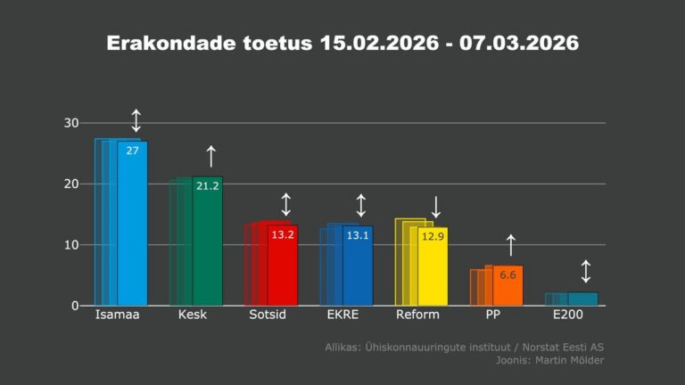 Avaldatud: 13 märts, 2026Erakondade toetusmaastik püsib võrreldes eelmise nädalaga suuresti muutumatu, märgib Tartu Ülikooli teadlane Martin Mölder.
