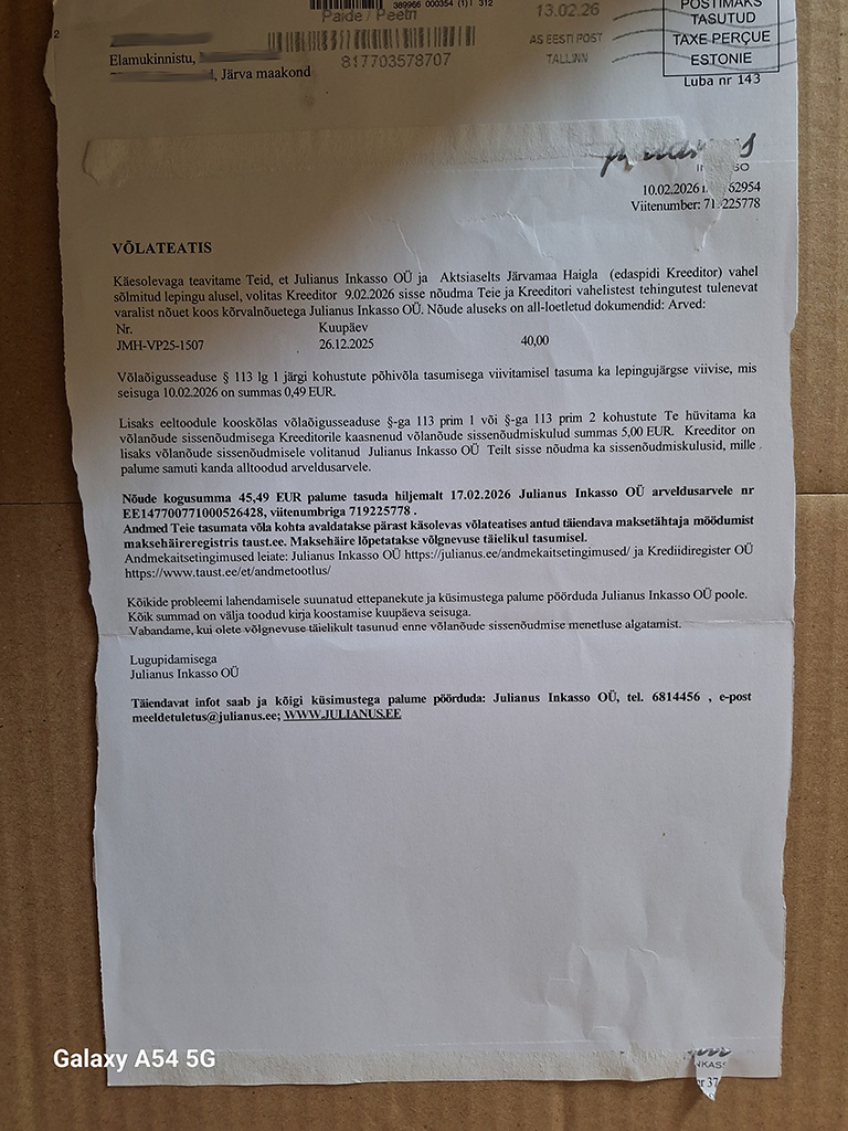 Avaldatud: 7 märts, 2026Lõunaeestlase toimetusega võttis ühendust Põlvamaa elanik, kes hoiatas, et Järvamaa haigla teenib Julianuse inkassole raha.