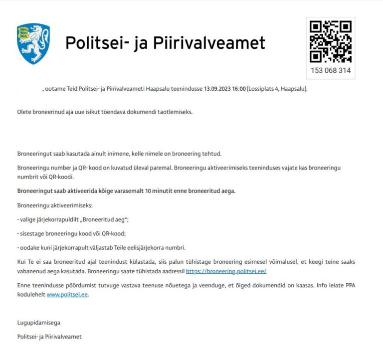 Avaldatud: 18 august, 2023Kelmid on hakanud tegema inimeste nimele PPA broneerimissüsteemis broneeringuid näiteks ID-kaardi taotlemiseks või ajutise kaitse saamiseks, et mõjuda helistatavale usaldusväärsena.