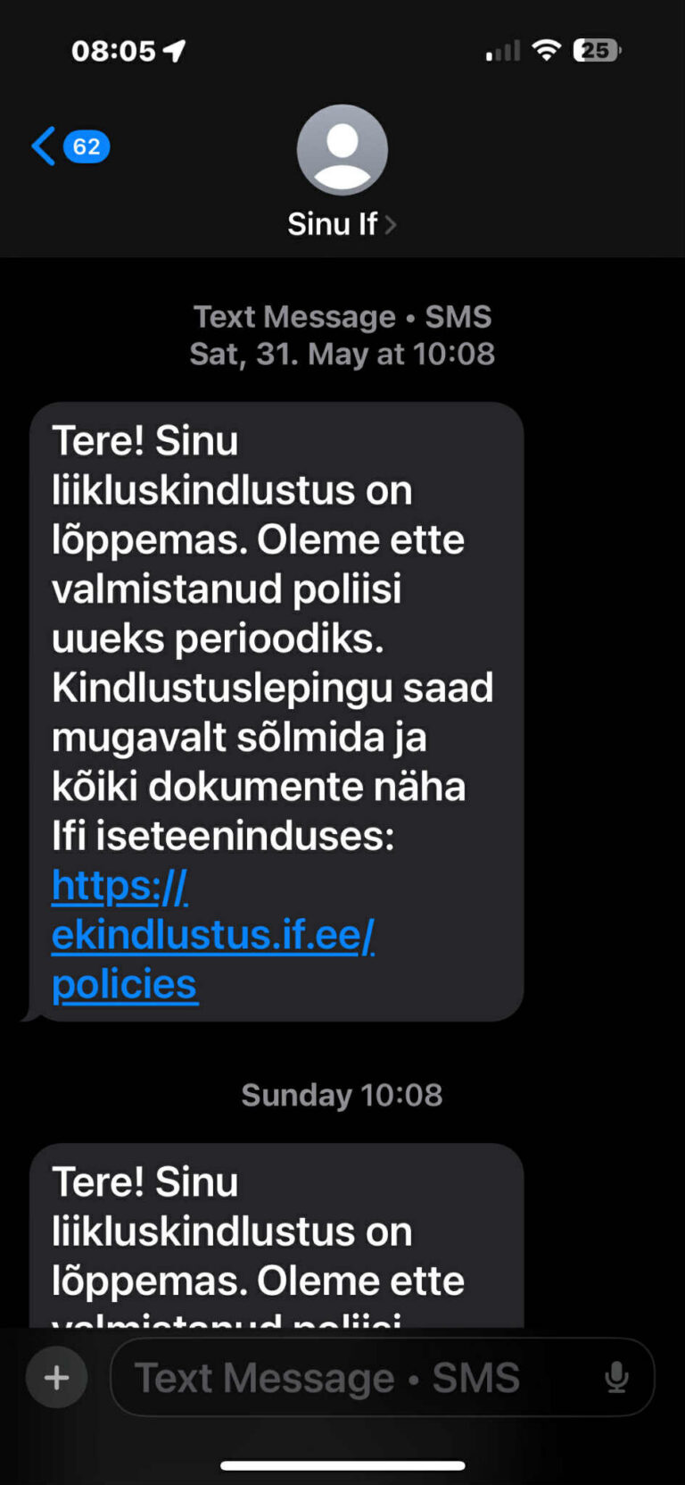 Kui on kahtlus, et tegemist on petusõnumiga, siis ei maksa lingile vajutada. Selle asemel on võimalik logida turvaliselt sisse If Kindlustuse iseteenindusse, kus on kõik klienti puudutav info alati olemas ja saab veenduda, kas tal hakkab tõesti hakkab näiteks liikluskindlustus lõppema. Samuti on oma lepingutele ligipääsemiseks olemas ka If Kindlustuse mobiilirakendus ja loomulikult, kui kliendil on mingi kahtlus või mure, siis on alati võimalus pöörduda ka klienditeeninduse poole.