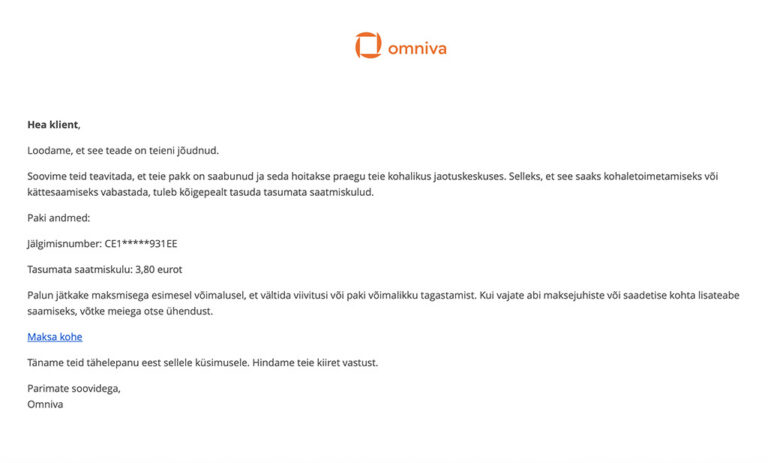 Avaldatud: 28 juuli, 2025Liikvel on Omniva nimelt saadetud pätikiri, milles palutakse maksta tasumata saatmiskulu. Kirja saatja real on aadress omniva@office.ee.