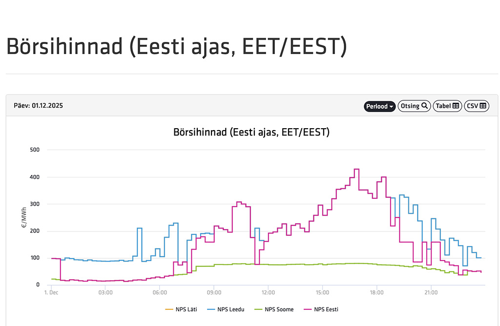 Avaldatud: 1 detsember, 2025Täna esmaspäeval 1. detsembril on elektri keskmine hind pea 150 eurot megavatt-tunni eest. Pärast tööpäeva küündib hind 429 euroni MWh kohta.
