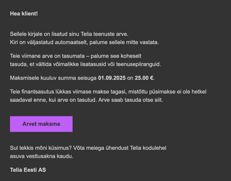 Teie viimane arve on tasumata – palume see koheselt tasuda, et vältida võimalikke lisatasusid või teenusepiiranguid.