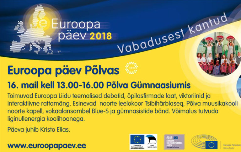Sündmus toimub Põlva Gümnaasiumis kella 13-16 ja sinna on oodatud kõik – nii noored kui vanad, nii õpilased kui õpetajad. Euroopa päeva Põlvas juhib teleekraanilt tuntud Kristo Elias, kes veab ka debatti Euroopa Liidu teemadel. Arutelul osaleb maaeluminister Tarmo Tamm, kes räägib noorte võimalustest EL-is ja sealjuures põllumajanduses ning kodanike, kaupade, teenuste ja kapitali vabast liikumisest. Debatti „Millist kultuuripärandit loome täna“ veab Annela Laaneots, kes on Euroopa Kultuuripärandiaasta 2018 projektijuht Eestis.