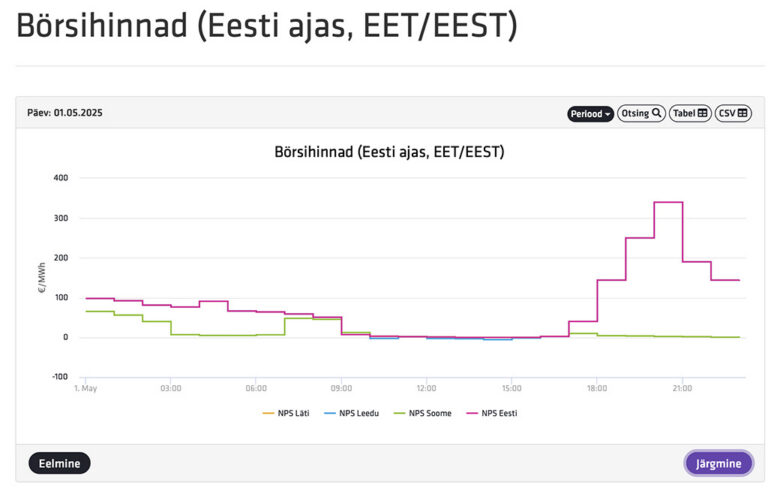 Kõige odavam, null eurot on elekter börsi andmetel vahemikus kell 13-15. Kell 20 tõuseb hind aga 340 euro peale MWh eest.
