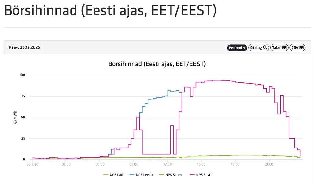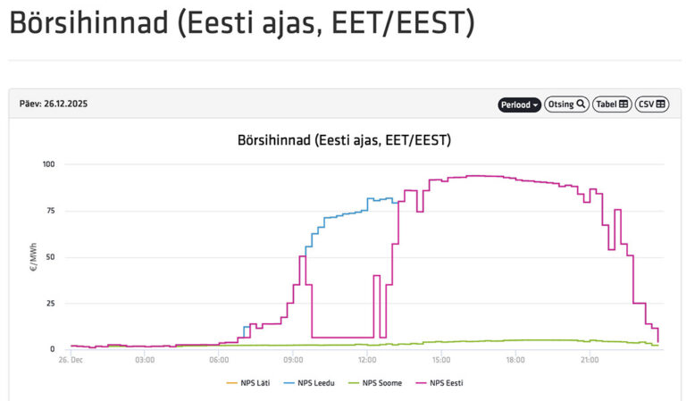 Avaldatud: 25 detsember, 2025Homme reedel, 26. detsembril teeb elektri hind Eestis suure hüppe. Kui täna oli keskmine hind 2,5 eurot MWh kohta, siis homme on see 40 eurot ehk üle 10 korra rohkem.