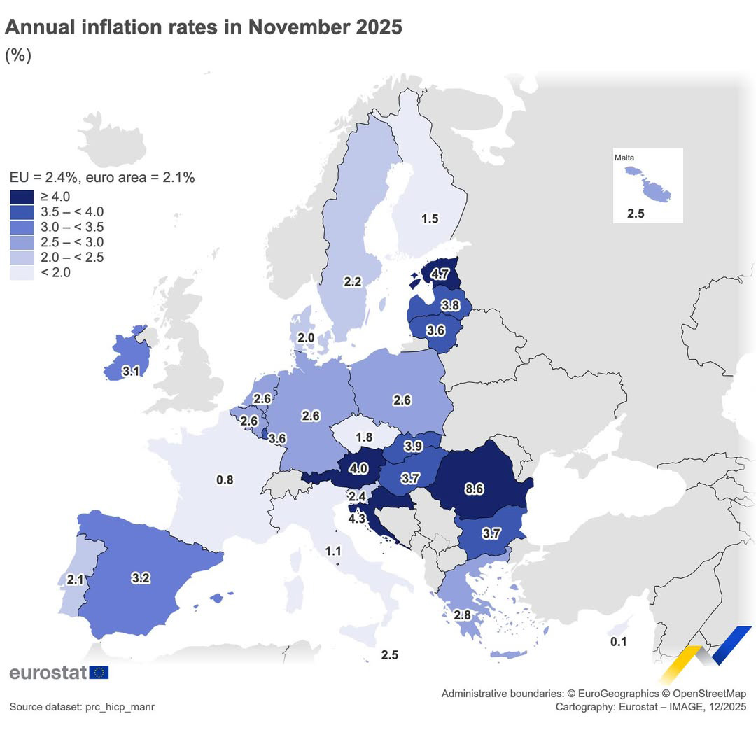 ELi liikmesriikide seas oli 2025. aasta novembris madalaim aastane inflatsioonimäär järgmistes riikides: