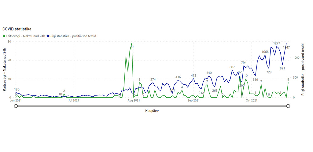 Avaldatud: 21 oktoober, 2021Kaitseväes on tänaseks päevaks vaktsineeritud COVID-19 viiruse vastu ligi 98 protsenti teenistujatest ja töötajatest. Vaktsineerimise positiivne mõju väljendub ka nakatumisnumbrites, mis on võrreldes kevadise viiruse leviku kõrghetkega vähenenud kordades.