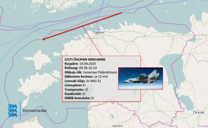 Kaitsevägi teatas, et reede, 19. septembri hommikul sisenesid Vaindloo saare piirkonnas 𝐢𝐥𝐦𝐚 𝐥𝐨𝐚𝐭𝐚 Eesti õhuruumi 𝐤𝐨𝐥𝐦 𝐕𝐞𝐧𝐞𝐦𝐚𝐚 𝐡𝐚̈𝐯𝐢𝐭𝐮𝐬𝐥𝐞𝐧𝐧𝐮𝐤𝐢𝐭 MIG-31, mis viibisid Eesti õhuruumis ligi kaksteist minutit.