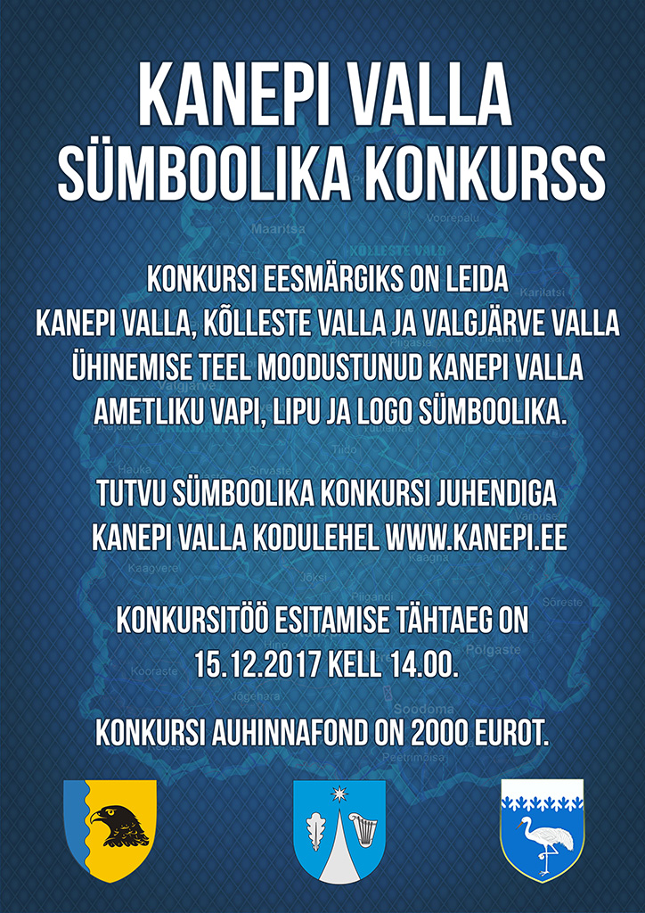 Avaldatud: 20 november, 2017Kanepi vald kuulutas välja sümboolika konkursi, mille eesmärk on leida Kanepi valla, Kõlleste valla ja Valgjärve valla ühinemise teel moodustunud Kanepi valla ametlik vapp, lipp ja logo.