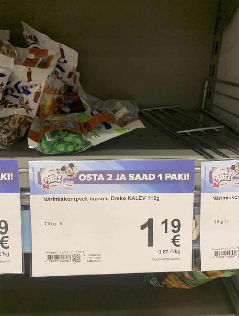 Avaldatud: 12 november, 2023Sotsiaalmeediasse on pandud pilt karmi pakkumise kohta poes, kus on Kalevi daarkonikommide juures silt, et osta 2, saad 1 paki.