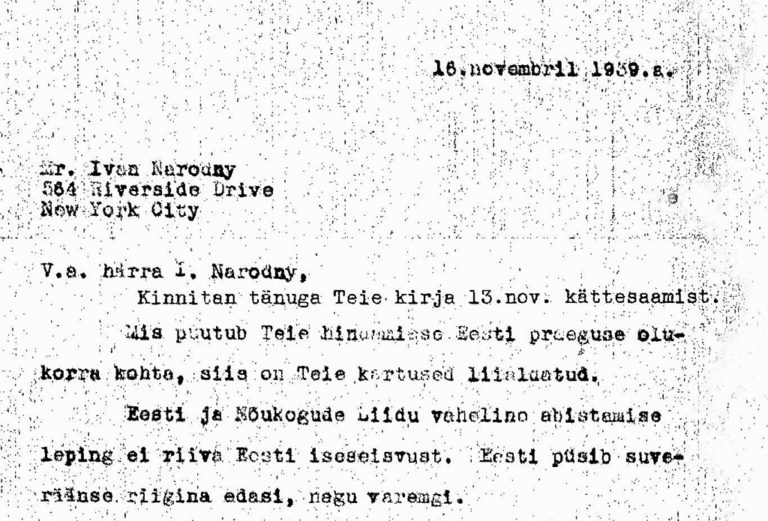 Nimelt oli Eesti sõlminud 1939. aastal Nõukogude Liiduga koostööleppe, mille peale tuli järelpärimine USA-s elavalt kirjanikult Ivan Narodny’lt. Eesti konsul New Yorgis vastas järelpärimisele nõnda: