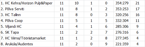 Kehra sai tänavuse rekordpubliku, 400 pealtvaataja silme all hooaja kümnenda võidu tulemusega 30:24. Vahnovitš ja Jankovski viskasid võitjate kasuks seitse, Janar Mägi viis ning Lees ja Strazdinš neli väravat. Viljandi poolel jäi Rodjukovi arvele kaheksa tabamust, Parik ja Hapal lisasid neli ning Drõgin kolm väravat.
