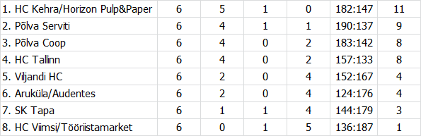 Avaldatud: 22 november, 2018Käsipalli meeste meistriliiga kuues voor muutis esikolmikut, ent mitte liidrit. HC Kehra/Horizon Pulp&Paper alistas võõrsil SK Tapa 35:25 (18:15) ning jätkab esikohal. Põlva Serviti sai samuti võõrsil kindla 41:25 (20:10) võidu HC Viimsi/Tööriistamarketi üle ning tõusis tabelis teiseks. Hooaega nelja võiduga alustanud HC Tallinn langes koguni neljandaks, Põlva Coopi taha.
