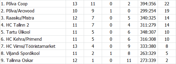 Põlva tiimid on lähedal, et kindlustada pääs poolfinaali. Heitlus neljale järgmisele kohale ehk veerandfinalistide ja -paaride selgitamine möödub ilmselt põnevalt viimase vooruni. Raasiku/Mistra ja HC Tallinn 2 on kogunud 14 ning Tartu Ülikool ja HC Kehra/Primend kümme punkti. HC Viimsi/Tööriistamarketil on kaheksa silma, kuid eespool olijatest kaks kohtumist enam peetud.