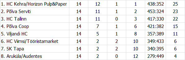 Avaldatud: 15 veebruar, 2019Eesti meeste meistriliigas lõppes neljapäeval põhiturniir. Viimastes mängudes üllatusi ei sündinud – liider HC Kehra/Horizon Pulp&Paper alistas võõrsil HC Viimsi/Tööriistamarketi 33:24 (18:13) ning HC Tallinn oli samuti võõrsil 34:26 (17:16) üle Põlva Coopist.