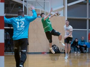 Eelmisel reedel kohtunud Serviti (valges) ja Mistra (rohelises) jätkavad Balti liigaga. Foto: Arvi Sirm / Eesti Käsipalliliit