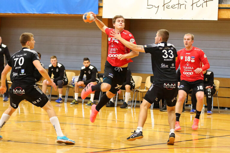 Alfred Timmo (viskel) aitas nädalavahetusel Põlva Servitit kahes võidumängus kümne tabamusega, neist kuus leidsid täna tee Tapa võrku. Foto: Helin Potter Pühapäeval peeti Põlvas ja Viljandis kaks käsipallimängu, mis Eesti klubide jaoks nii Balti liiga kui ka kohaliku meistrisarja arvestusse läksid. Põlva Serviti alistas SK Tapa/N.R. Energy 31:26 (15:14) ning Viljandi HC tuli välja suurest kaotusseisust ning võitis HC Kehra/Horizon Pulp&Paperi 25:20 (7:12).