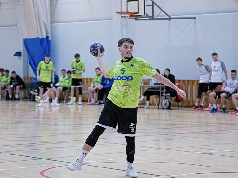 Aruküla SK liider Martin Kalvet on meeskonna eest visanud juba 117 väravat. Foto: Arvi Sirm/ Mistra/ arhiiv Pühadenädala ainukene kohtumine toimus Aruküla SK ja Musamäe Käsipalliklubi vahel. Tabeli teises pooles asuvad meeskonnad pidasid tasavägise esimese poolaja, kuid teisel poolajal pani tabelis eespool olev Aruküla SK oma paremuse maksma ning sai kirja võidupunktid tulemusega 41:34 (18:17).