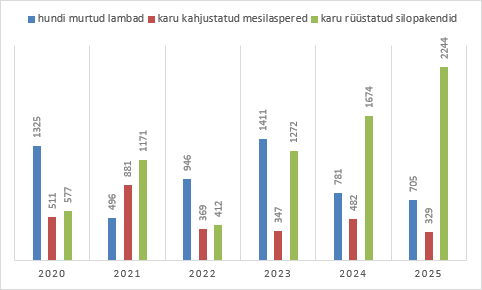 Viimastel aastatel Keskkonnaametile teadaolev huntide poolt murtud lammaste arv ja karude kahjustatud mesilaspered ja silopakendid. Allikas: Keskkonnaamet Keskkonnaamet toetab olulise hüvitisega loomakahjude ennetamiseks efektiivsete ennetusmeetmete rakendamist ning võttis kokku 2025. aastal suurkiskjate, hüljeste ja kotkaste tekitatud kahjud. Vaatamata Eesti suurkiskjate asurkondade väga heale seisundile ja meedias suure tähelepanu pälvimisele olid hundi ja pruunkaru tekitatud kahjud möödunud aastal võrreldes paari varasemaga valdavalt langustrendis.