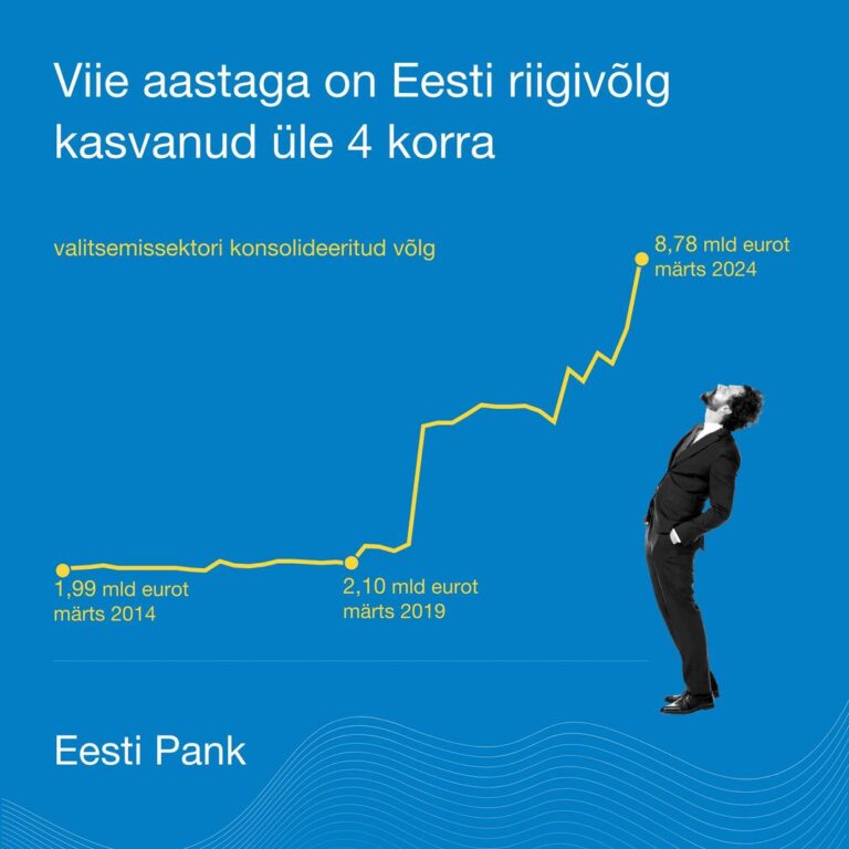 Avaldatud: 20 juuli, 2024Värske statistika põhjal on Eesti riigivõlg täna 45 protsenti suurem kui aasta eest ning 5 aastaga kasvanud üle 4 korra. Eesti Panga president Madis Müller selgitab oma artiklis, milliseid probleeme tekitab Eestile kiiresti kasvav riigivõlg.