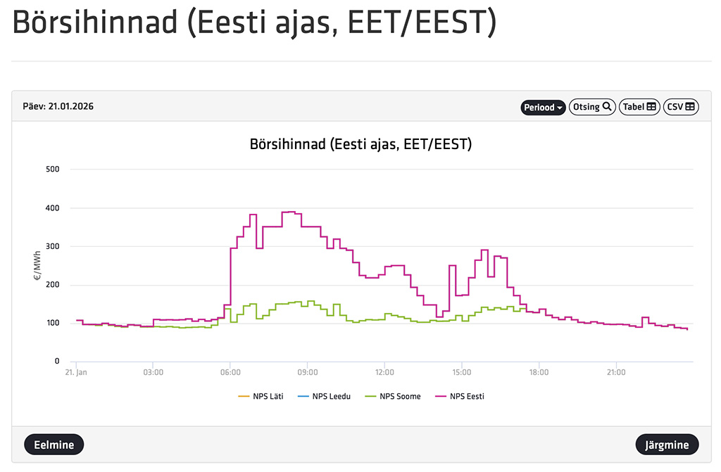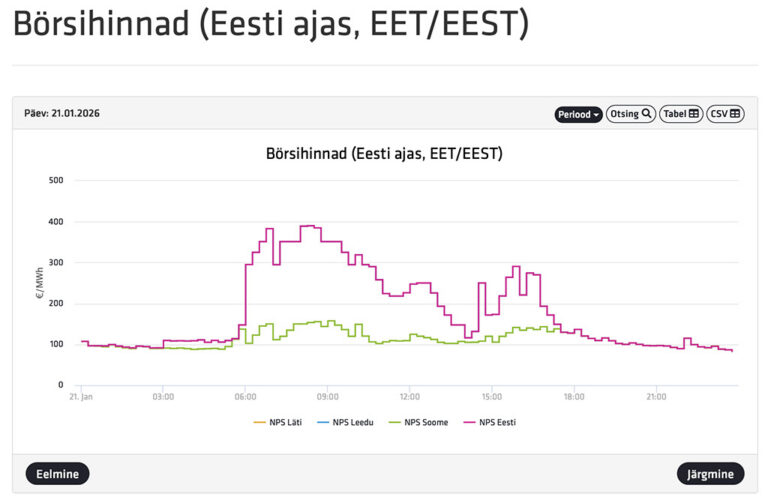 Avaldatud: 20 jaanuar, 2026Elektri börsihind on Eestis iga päevaga kallinenud ja homme kolmapäeval, 21. jaanuaril testitakse juba 400 euro psühholoogilist taset.