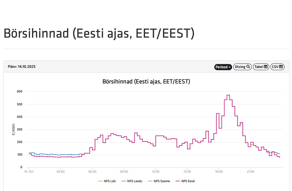 NordPooli elektribörsi andmetel on hind juba päeval suhteliselt kõrge, ligi 200 eurot MWh kohta. Kella 18 ajal tõuseb hind üle 400 euro MWh kohta ja kella 19 ajal on hind 572 eurot MWh kohta.