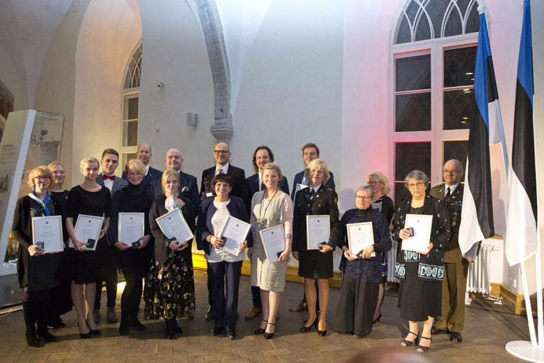 Juuresoleval fotol on kodanikupäeva aumärgi saajad (Kätlin Nukka vasakult kolmas, Igor Taro vasakult kuues) ja aasta kodanik Rasmus Rask koos ministrite Andres Anvelti ja Indrek Saarega. Foto: Annika Haas.