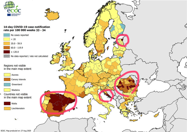 Kõige hullemas olukorras on Euroopas aga Hispaania, kus on 191,9 nakatumist 14 päeva jooksul 100 000 elaniku kohta. Järgnevad Malta (123,2), Luksemburg (102,3), Rumeenia (84,8) ja Horvaatia (74,0).
