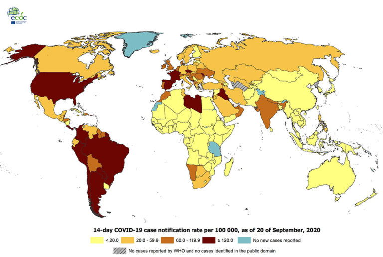 Avaldatud: 20 september, 2020Juuresolevalt Euroopa haiguse kontrollikeskuse ECDC kaardilt on näha, kuidas koroona levik maailmas on väga ebaühtlane.