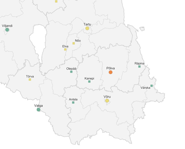 Võrreldes eelneva nädalaga on rohelisest kollaseks värvunud Võru linn, mis tähendab koroona mõõdukat taet. Niisamuti on rohelisest kolaseks värvunud Tõrva linn.