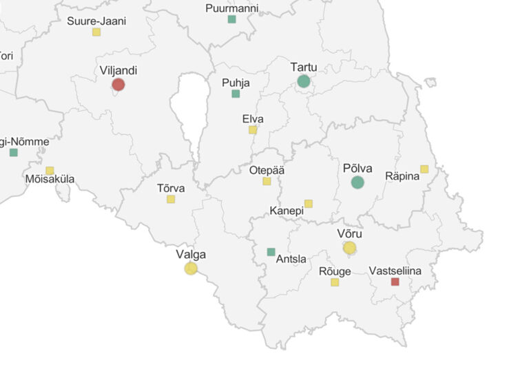 Põlva ja Antsla on värskel, 17. nädala kaardil suisa rohelised, mis näitab, et viirust on vähe. Kollasel ehk mõõdukal tasemel on Valga, Võru, Otepää, Räpina, Tõrva, Kanepi ja Rõuge. Punane ehk kõrge tasemega on Vastseliina.