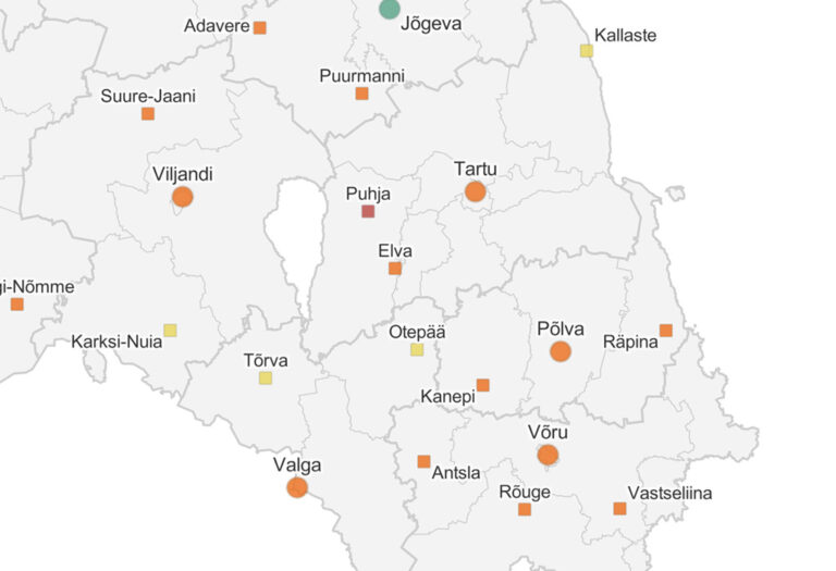 Punased, või õigemini oranžid täpid tähendavad, et viirus laialt levinud. Ainsad heledamad, kollased täpid on kaardil Tõrva ja Otepää.