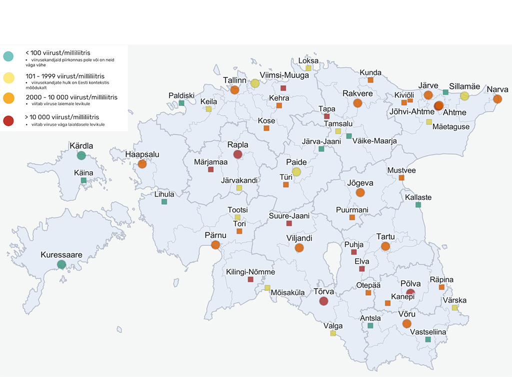 Kuigi väga suure ja mõõduka viirusesisaldusega proove on vähemaks jäänud, on palju viirust sisaldavate proovide hulk nädalaga mõnevõrra kasvanud. Piirkondlikke erinevusi võib esile tuua Lääne- ja Lõuna-Eesti vahel. Kui lääne pool on viirusekogus vähenenud, siis Lõuna-Eestis püsib see jätkuvalt Eesti keskmisest suurem. „Hea uudis on, et pea kõigis suuremates asulates on viirusekogus veidi vähenenud. Siiski paistavad teiste asulatega võrreldes väga suure viirusekoguse poolest silma Põlva ja Tõrva,“ rääkis Tenson.