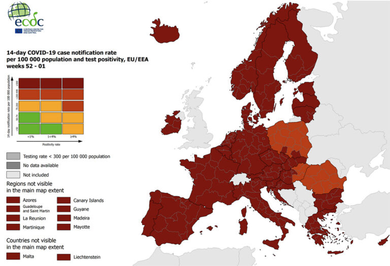 Euroopas on praegu koroona pilt väga kole. ECDC indikatiivsel koroonakaardil on kõik riigid kas punased või tumepunased, mis näitab väga kõrget nakatumiste taset.