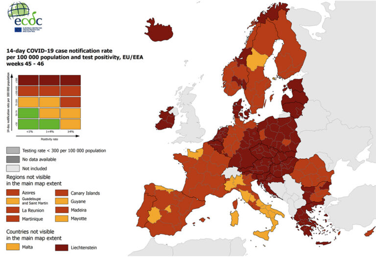 Euroopa haiguste kontrollikeskuse ECDC andmetel oli eelmise, 46. nädala seisuga kõrgeim nakatumiste tase Sloveenias (2137 juhtu 14 päeva jooksul 100 000 elaniku kohta). Võrdluseks, see on 10 korda kõrgem tase kui Soomes ja üle 2 korra kõrgem tase kui Eestis. Järgnevad Slovakkia (2038), Austria (1992), Tšehhi (1721), Horvaatia (1704), Belgia (1610) ja Liechtenstein (1394).